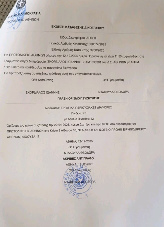Η αγωγή κατατέθηκε επισήμως την Παρασκευή 12 Δεκεμβρίου 2025, στο Πρωτοδικείο Αθηνών και έχει προσδιοριστεί να συζητηθεί τη Δευτέρα 20 Απριλίου 2026 και ώρα 09:00, στο Πρωτοδικείο Αθηνών, στο πλαίσιο της διαδικασίας Εργατικών – Περιουσιακών Διαφορών.