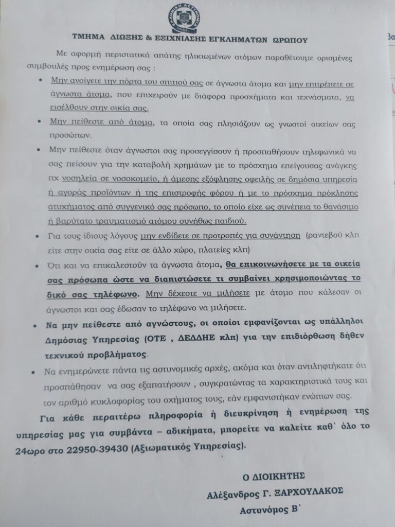 Συντονισμένη πρωτοβουλία για την ενημέρωση και προστασία των ηλικιωμένων από φαινόμενα τηλεφωνικής και δια ζώσης απάτης βρίσκεται σε εξέλιξη στον Δήμο Ωρωπού, με τη συνεργασία της Αστυνομίας, της Εκκλησίας και της Τοπικής Αυτοδιοίκησης.